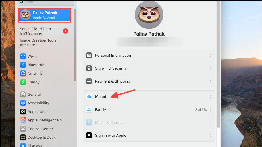Step 2: Click your Apple ID on the left and then on "iCloud" on the right.