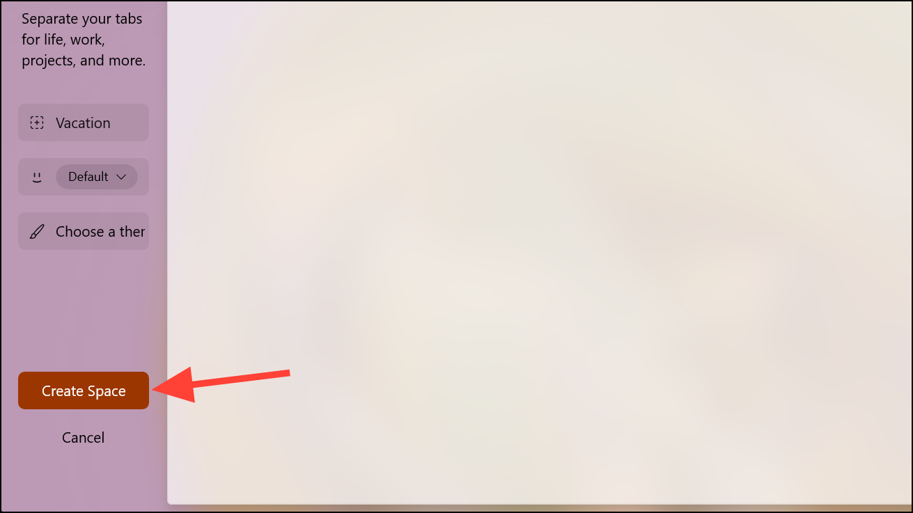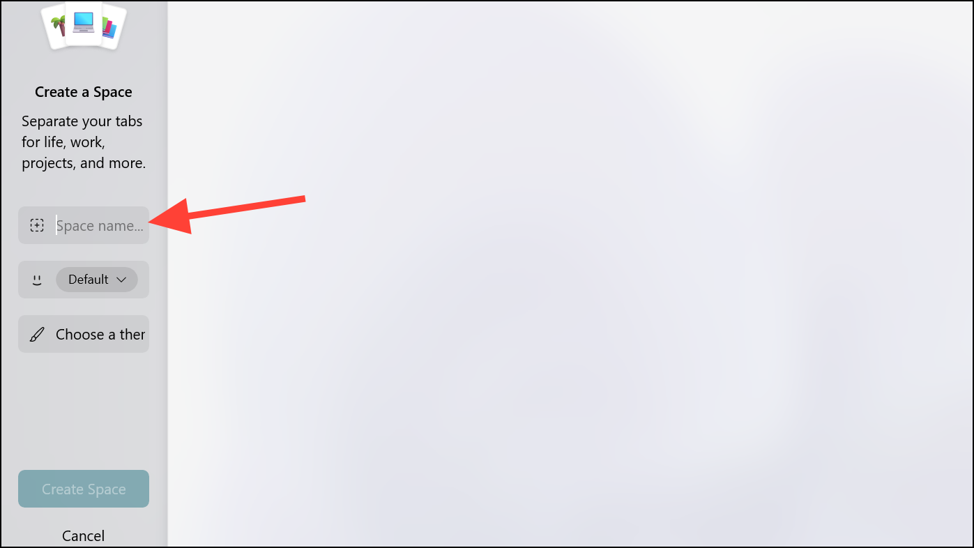 - The interface to create a new Space will appear. Enter a name for the 'Space' in the Space name field. This could be 'Personal' if you're creating it for personal browsing, or 'Vacation' if you're creating it to keep all the tabs you need to book and manage your vacation in one place, for instance.