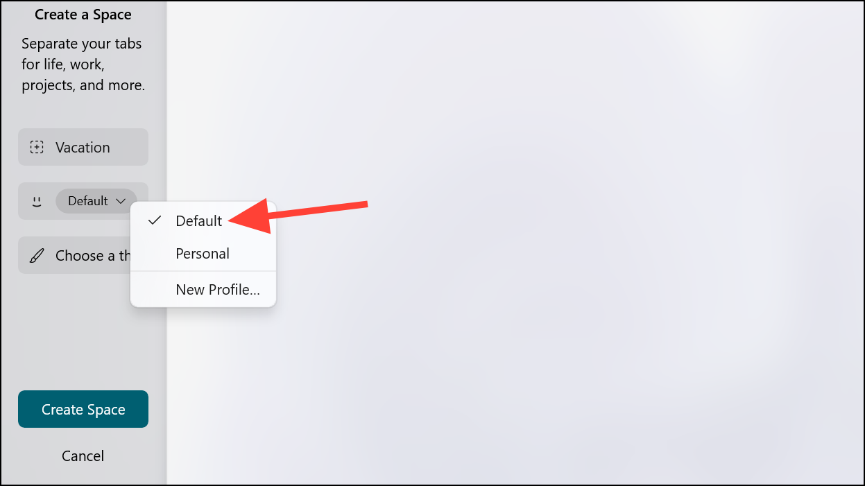 - Then, select which Profile you want to assign to the Space. By default, it'll use the 'Default' profile. Click on the drop-down menu and select another profile from the menu or click on 'New Profile' to create a new one. Spaces that share a profile will have the same 'Favorites'. You can also log in using different accounts on the same websites with different profiles.