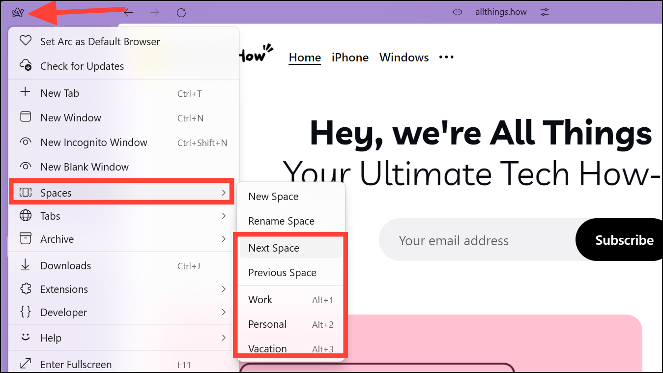 Alt+[Space Number]to navigate between spaces. - Or, click the 'Arc' icon in the top-left. From the menu, go to 'Space' and 'Next Space' or 'Previous Space' or the Space's name from the sub-menu.