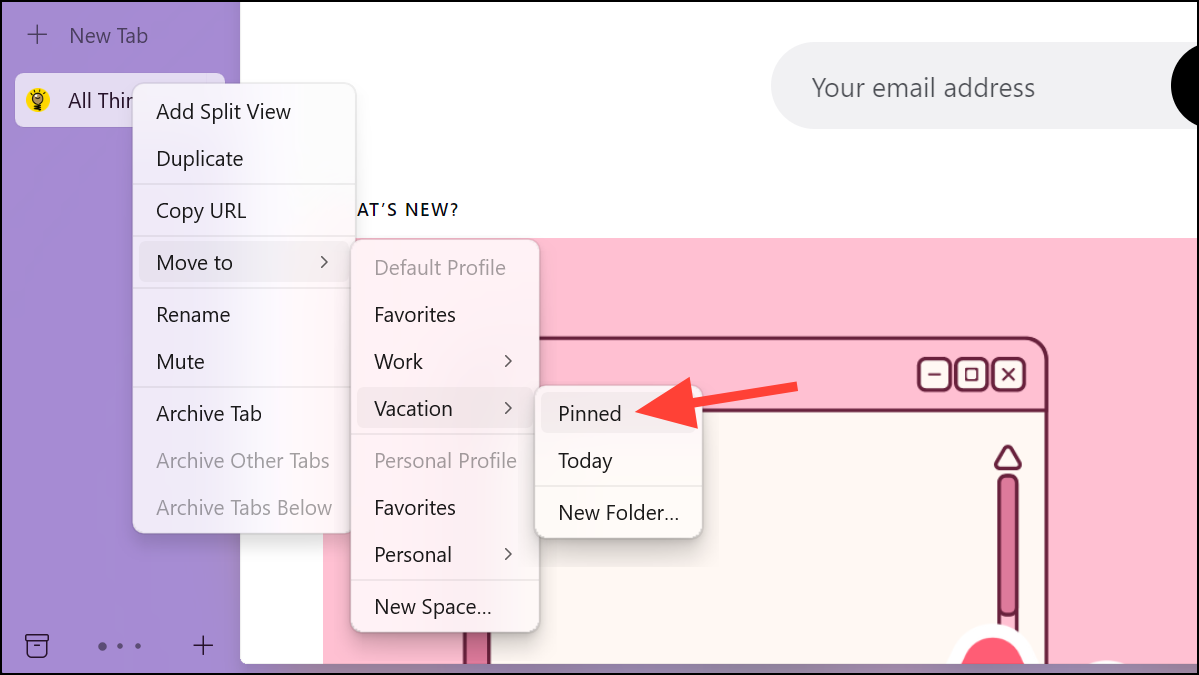 - Then, go to the Space's name to which you want to move the tab and select where you want to move the tab, i.e., Pinned section, Today section, or to a folder (you can also create a new folder).