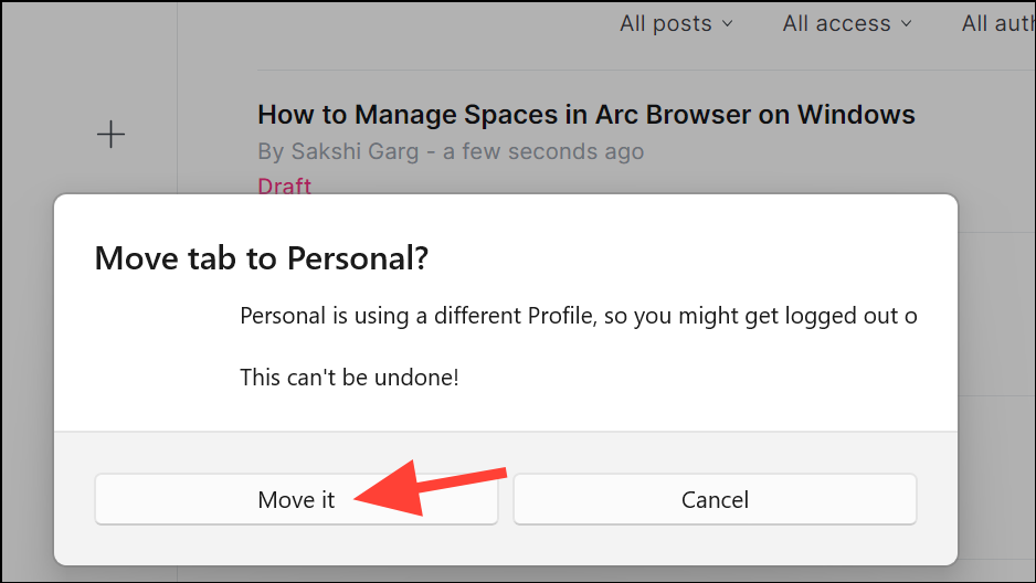 - If you move the tab between different profiles, you could be logged out of an account if you're not logged into it in the other profile. Click 'Move it' from the dialog box that appears if you want to proceed.