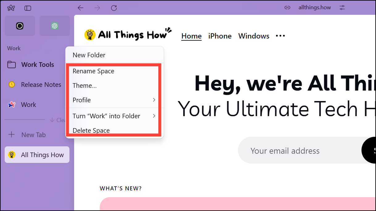 Spaces in Arc Browser are set up within the same browsing space without the need to switch to a different instance of the browser, like you have to do with other browsers. Each Space can have its own different Pinned Tabs and Themes while having the same Favorites. You can also have a completely different Space by creating a different Profile for it. Arc Browser in Windows does not support icons for Spaces yet.