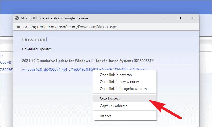 - In the new window, right-click on the link beneath the update package title and select 'Save link as' from the context menu.