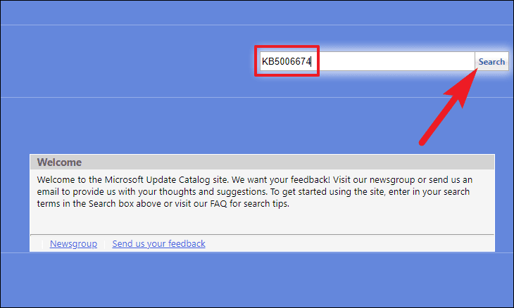 - In the search bar on the website, enter the KB (Knowledge Base) number of the Windows update you want to download. Press