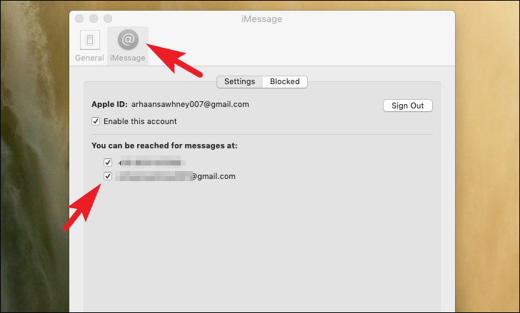 Now, on the ‘Preferences’ window, click on the ‘iMessage’ tab. Then, locate the ‘You can be reached for messages at:’ section and click to tick the checkbox preceding your Apple ID address to start receiving iMessages, if not already checked.