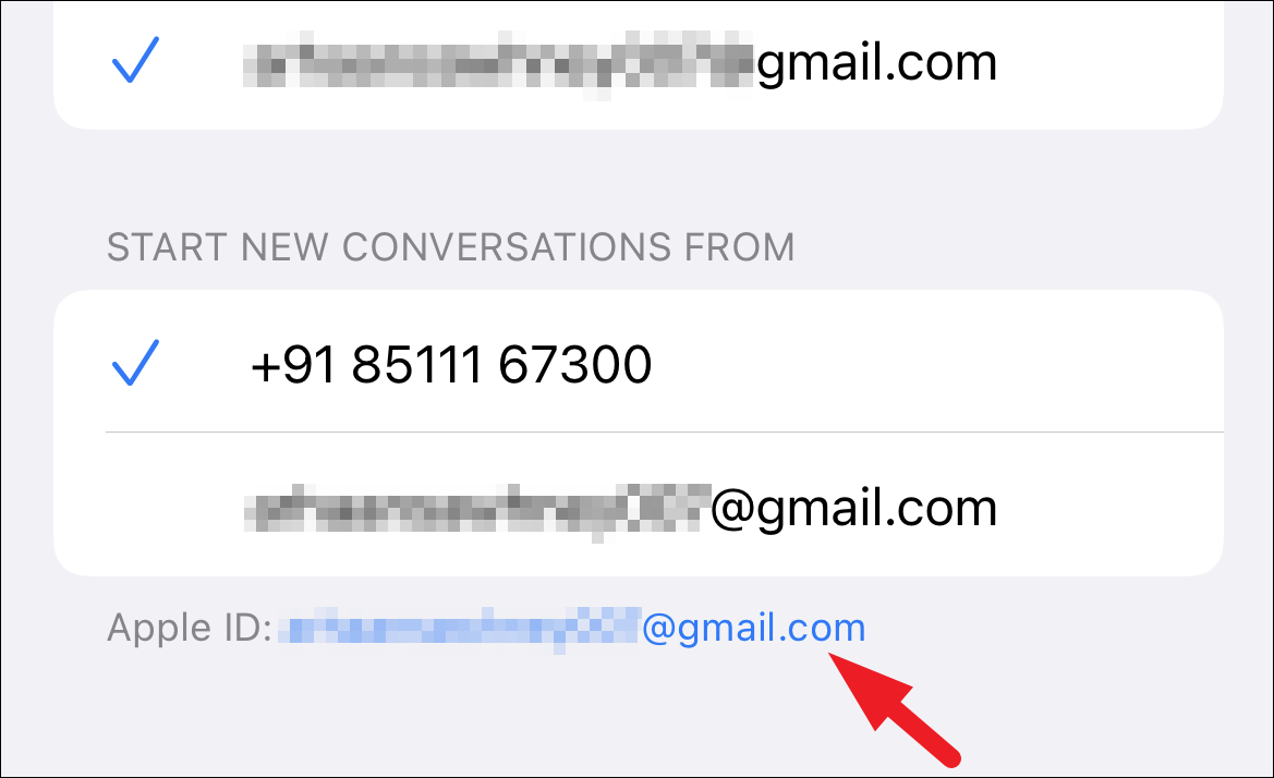 Next, locate the ‘Start New Conversations’ section on the page and then click on your Apple ID present under the section. This will bring up an overlay banner on your screen.