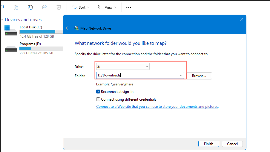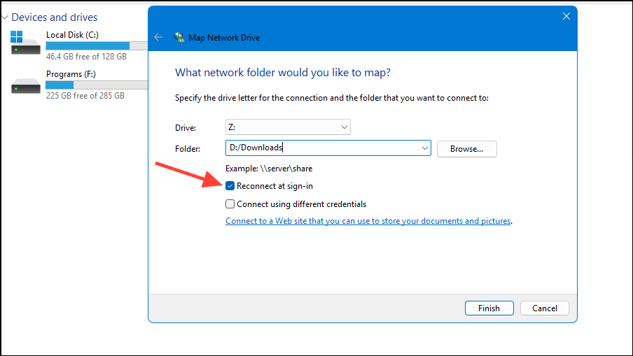 Step 6: Click "Finish" to create the mapped drive. If prompted, enter the username and password for the network location. You can also check "Remember my credentials" to avoid re-entering this information later.