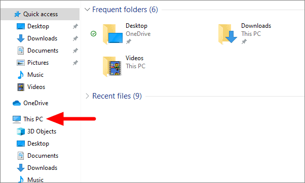 In File Explorer, click on ‘This PC’ at the left.