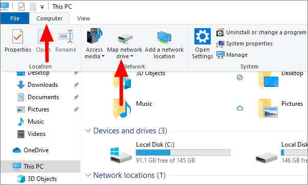 Now, go to the ‘Computer’ tab at the top and then select ‘Map network drive’ from the menu.