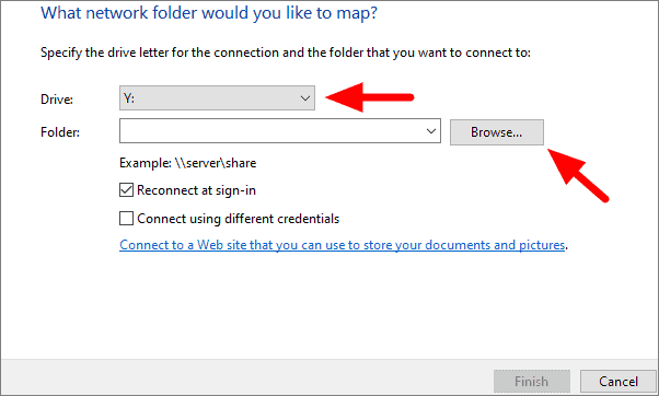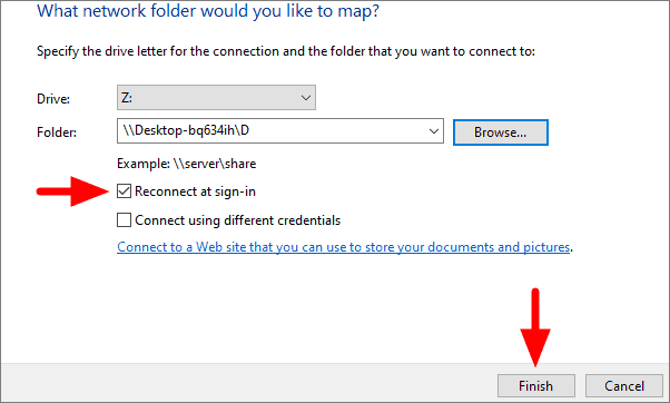 If you want to connect to the mapped drive every time you log in to your system, tick the checkbox for ‘Reconnect at sign-in’. Click on ‘Finish’ at the bottom after configuring drive mapping.