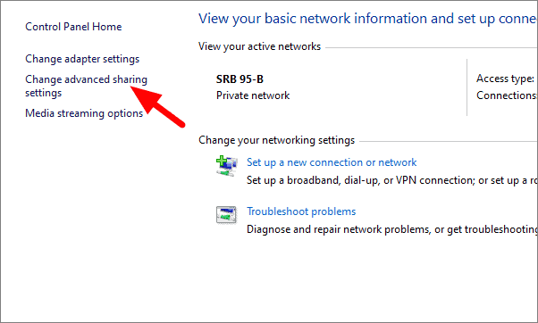 In ‘Network and Sharing Center’, you will see active networks and can access its detail. Click on ‘Change advanced sharing settings’ on the left.