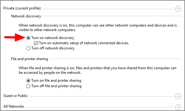 In this window, you have to option to change the network settings on both private and public networks. Verify if the ‘Turn on network discovery’ is selected under Private, which is the current profile. Turn network discovery on in case it is turned off. Also, tick the checkbox for ‘Turn on automatic setup of network connected devices’.