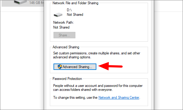 Here, you can see if the device is shared or not. In case, sharing is not enabled, click on ‘Advanced Sharing’.