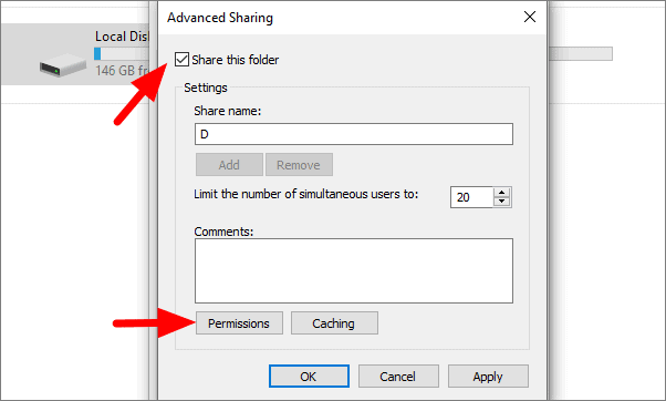 Now, tick the checkbox adjoining the ‘Share this folder’ option. You can also modify the level of access you wish to provide by clicking on ‘Permissions.’