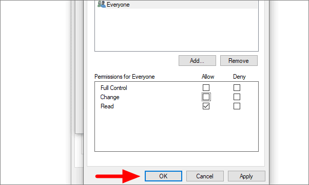 Select what kind of sharing control you want to enable under ‘Permissions for Everyone’ and then click ‘OK’ at the bottom.