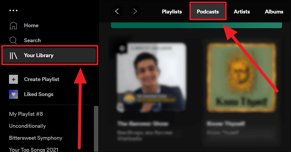 Launch Spotify on your computer, click the ‘Your library’ option to the top left of the screen, and select the ‘Podcasts’ tab to the right. Now locate the podcast containing the episode you want to mark as ‘Played’ and click to open it.