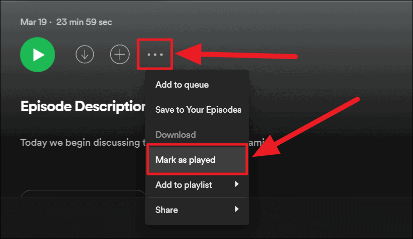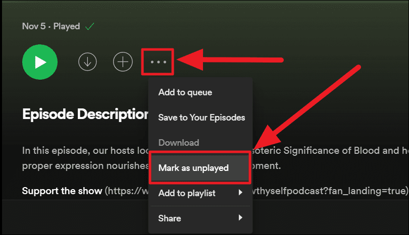 Alternatively, you can also open the particular episode and then click the ellipsis icon (three horizontal dots) below the episode’s credentials. Select ‘Mark as unplayed’ from the menu.