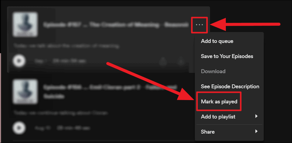 Marking podcasts as ‘Played’ has quite a few benefits for a regular podcast listener. It’s a great feature if your Spotify doesn’t register completed episodes and continues playing the same, or if you want to hide a couple of episodes for other reasons.