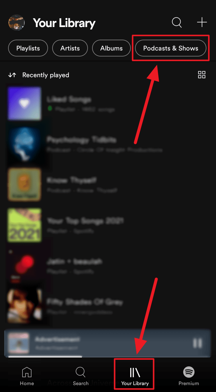 Open Spotify on your phone, tap the ‘Library’ button to the bottom left of the screen. Select the ‘Podcasts and shows’ tab.