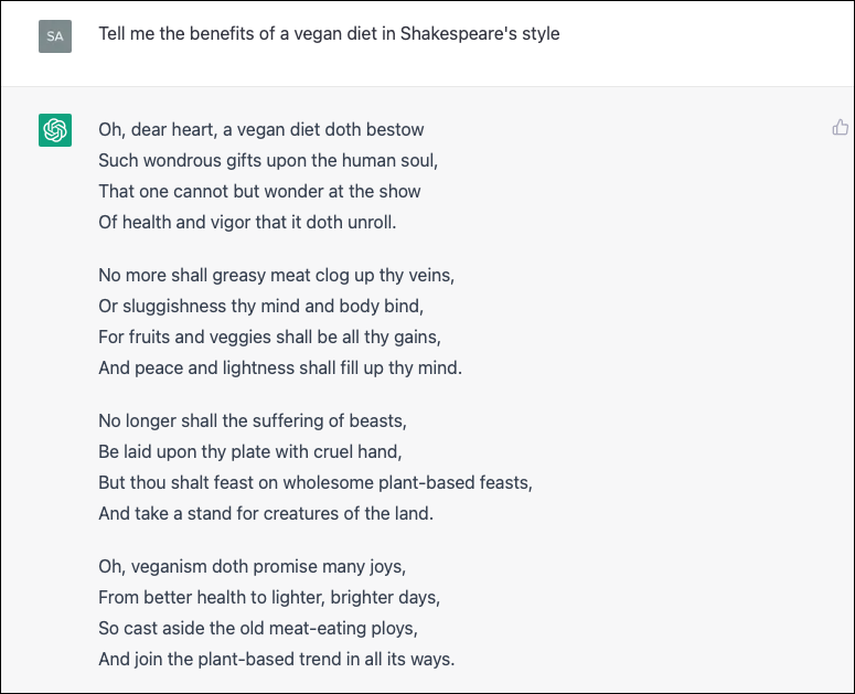 Similar to giving ChatGPT a personality, you can ask it to speak in the style of your favorite author. Of course, it can't mimic their genius, but it can mimic their style rather closely.