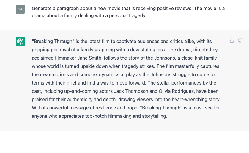 With zero-shot prompting, we don't specifically train ChatGPT to generate text about this particular movie or genre. Instead, we rely on its general knowledge of language patterns and relationships to create a response. The output may be less accurate or relevant than with few-shot prompting, which we'll learn about in a bit.