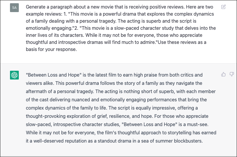 With few-shot prompting, we trained ChatGPT on a small set of examples (the two reviews) for generating text about the specific movie genre and context.