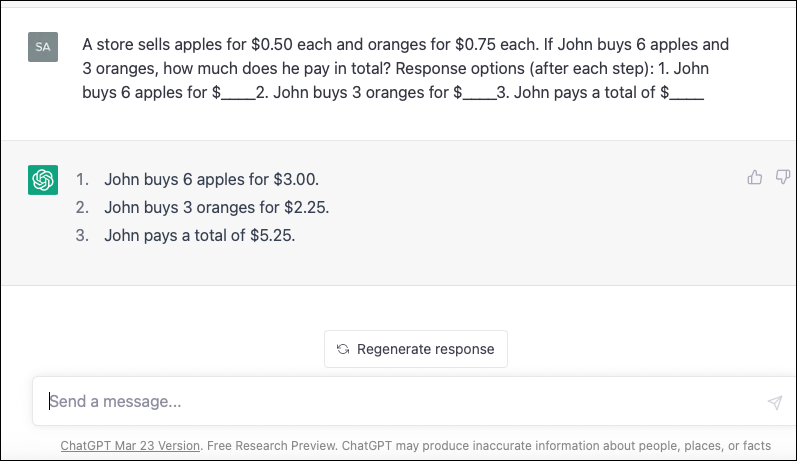The following prompt, for example, guides ChatGPT through the problem step-by-step, building upon previous responses to arrive at the final answer: