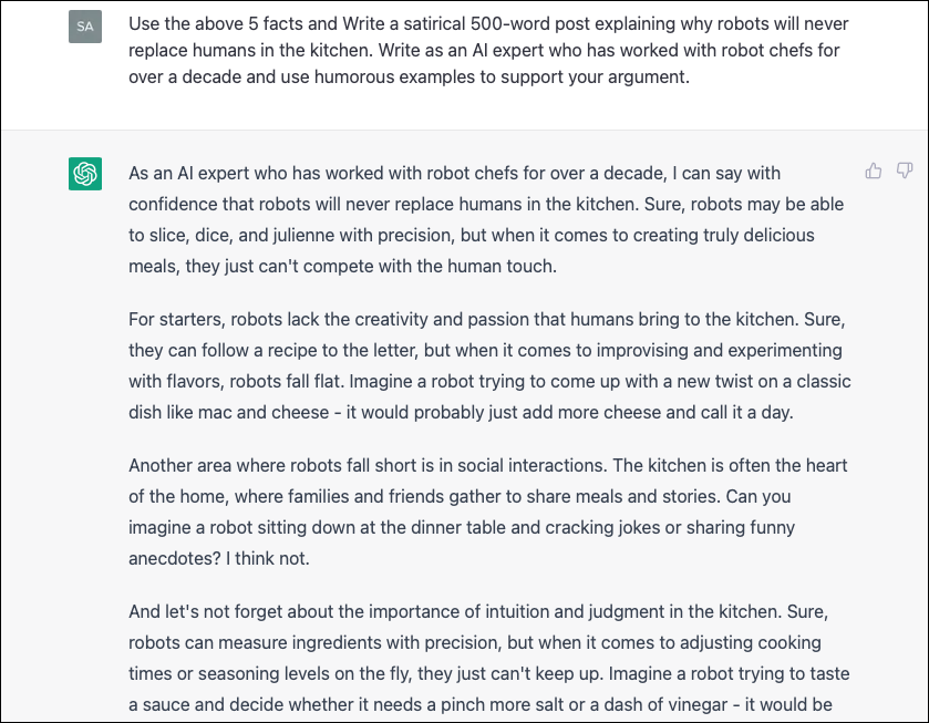 Use the above facts and write a satirical 500-word post explaining why robots will never replace humans in the kitchen. Write as an AI expert who has worked with robot chefs for over a decade and use humorous examples to support your argument.