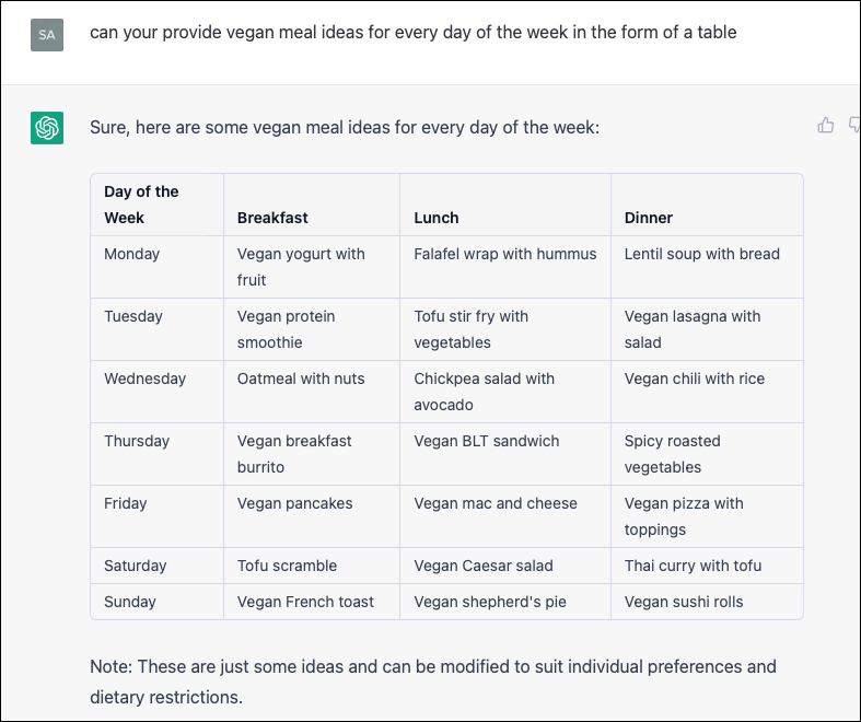 For example, if you want ChatGPT's help to generate a meal plan for the week, asking it to do so in tabular form can keep the information better organized.