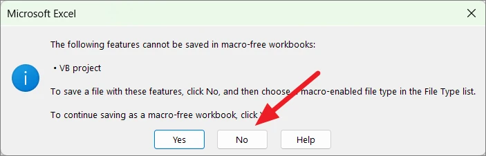 The VB script needs to be saved in a macro-enabled file type. Once you click ‘Save’, you will see a prompt box asking whether you want to save this file in a macro-free file or macro-enabled file type.