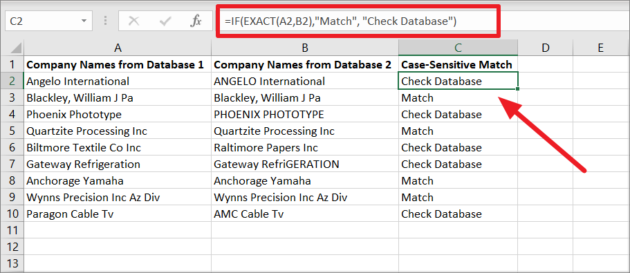 =IF(EXACT(A3,B3),"Match", "Check Database")In the above formula, the EXACT function checks whether the values in cells A3 and B3 are exact case-sensitive matches or not. However, the first-word ‘ANGELO’ is capitalized in B2 which is different from the company name in A2, so the EXACT function returns FALSE. Hence, the IF function returns the “Check Database” text string for the FALSE output.