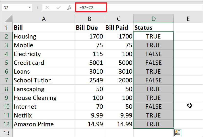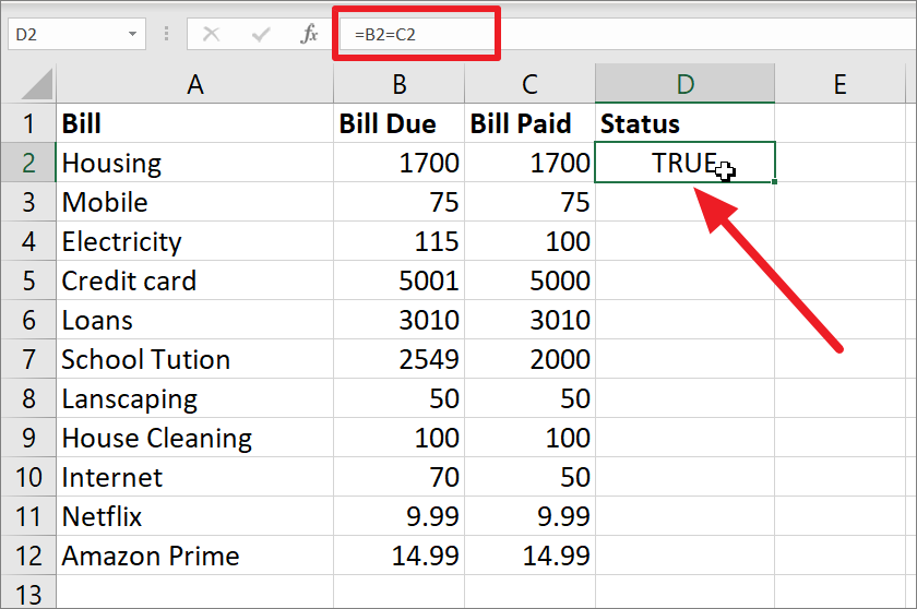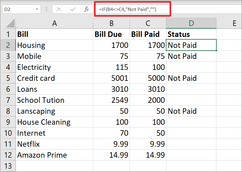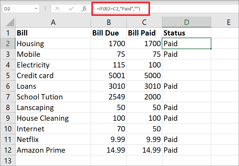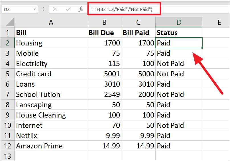 =IF(B2=C2,"Paid","Not Paid")In the above formula, the IF function checks if the value in B2 is equal to the value in C2, and if the condition is True, it returns the text “Paid”. If the condition is False, it returns “Not Paid”. The Bill due amount in B2 and Bill Paid amount in C2 are the same, so it returns “Paid” in D2. But the amount in B5 and C5 do not match, so the formula returns “Not Paid” in D5.