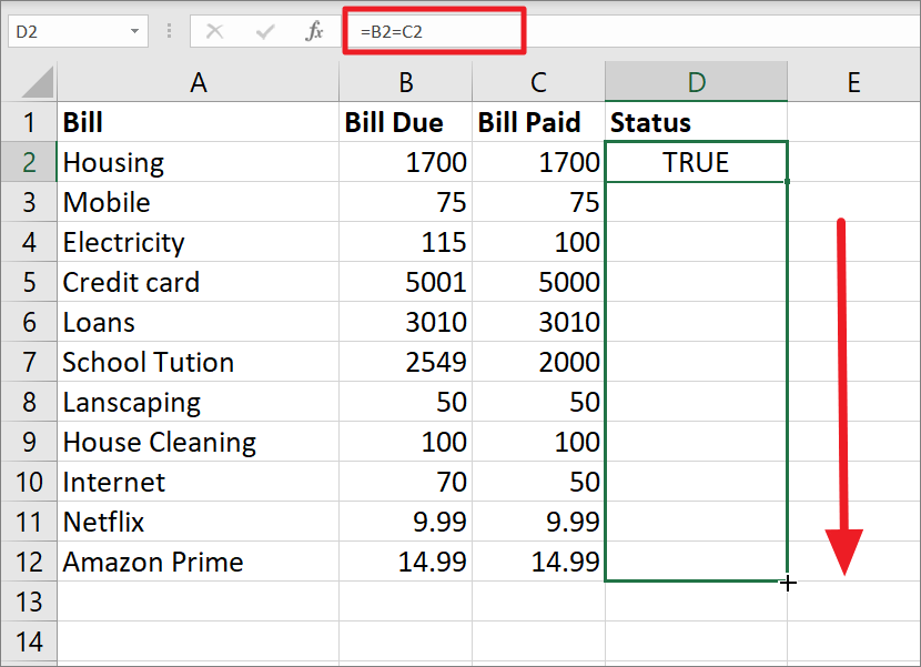 For example, we will compare two columns (Bill Due and Bill Paid in the screenshot below) to see if they match. To do that, we will use the below simple formula: