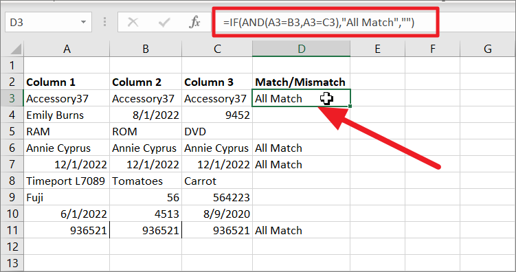 As you can see below, the AND function will return true if all the cells have the same value in the same row. Then, the IF function will return the text “All Match” if the AND function returns TRUE.