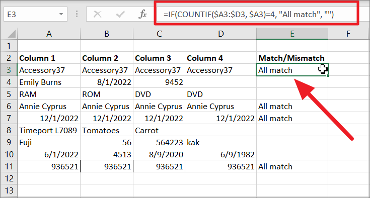 The COUNTIF formula checks whether the row has the same values in all cells (A3:D3), and returns the total number of matches. And if all the columns match within the same row (the result of the COUNTIF function) is equal to the number of columns, you will get the text string that says “All match”.