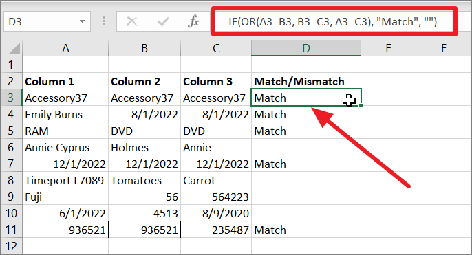 Method 1: Suppose you have multiple (3) columns and you want to find matches in any of the two columns in the same row, you can do that with the help of the IF and OR functions. To do this, we can use the below formula: