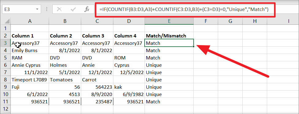 =IF(COUNTIF(B3:D3,A3)+COUNTIF(C3:D3,B3)+(C3=D3)=0,"Unique","Match")Here, the first COUNTIF function checks and counts how many cells (columns) have the same value as the first column (A3), and the second COUNTIF function checks how many columns have the same values as the second column, and so on. Then all the COUNTIF function results are added up. So, if the final count is equal to 0, the formula will return the ‘Unique’ text string. If the count is anything other than 0, we will get ‘Match’ as the result.