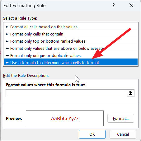 This will open the New Formatting Rule dialog box. In that dialog window, select the rule type ‘Use a formula to determine which cells to format’.