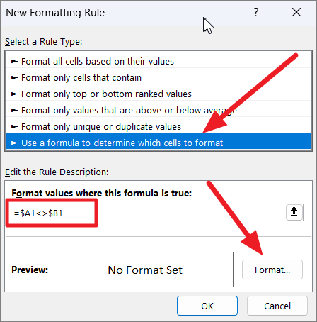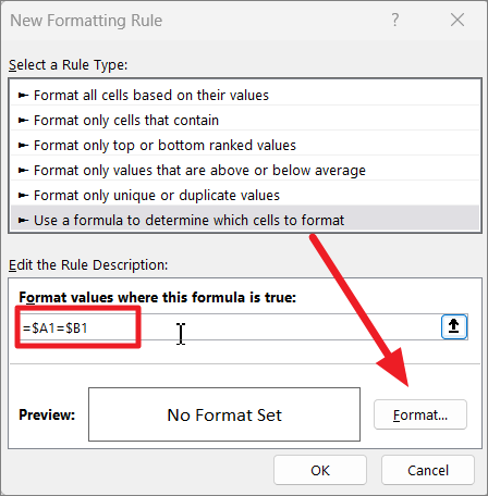 =$A1=$B1=FALSEFirst, select the dataset and open the New formatting rule window, as we showed you above, and then select the ‘Use a formula to determine which cells to format’ rule type. Then, enter one of the above rules and click the ‘Format’ button.