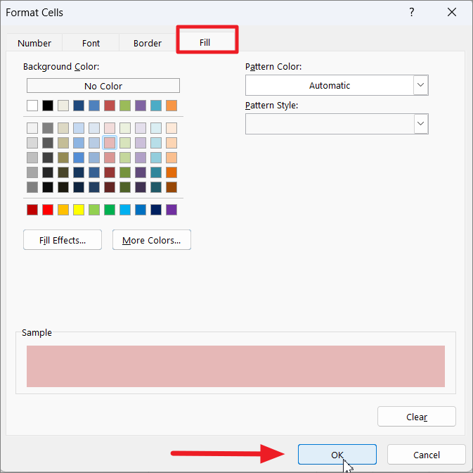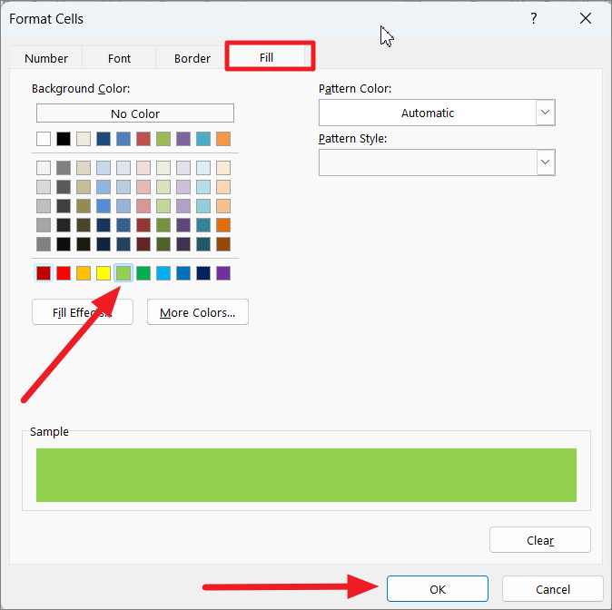 In the Format cells dialog window, you can change the font size, font color, cell borders, number format, etc. To highlight matching rows with different background colors, switch to the Fill tab and choose the color from the Background color section. You can also change the pattern style and pattern color of the highlighted cells. Once you are done choosing the format, click the ‘OK’ button.