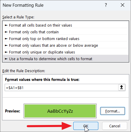 =$A1=$B1As you can see, this is a simple ‘equals to’ formula that checks whether the value in cell A1 is equal to B1. But we have added the ‘$’ sign before the column labels A and B to lock the columns into absolute references. So, only the row number automatically changes for each row when the formula is applied.