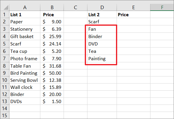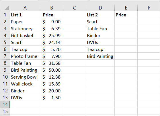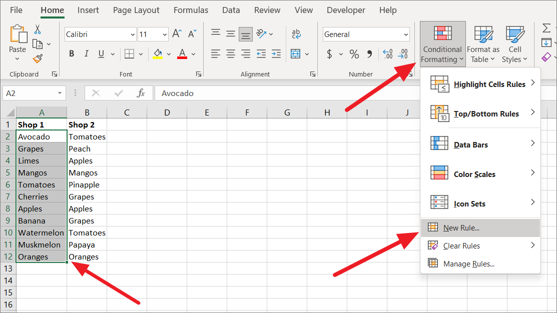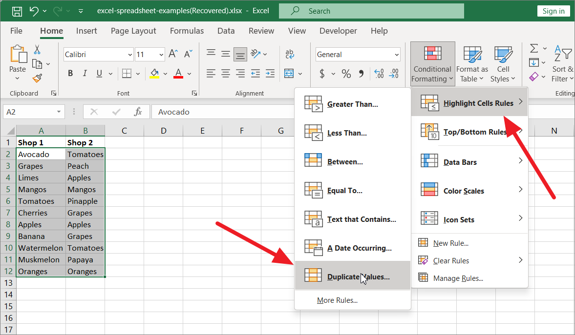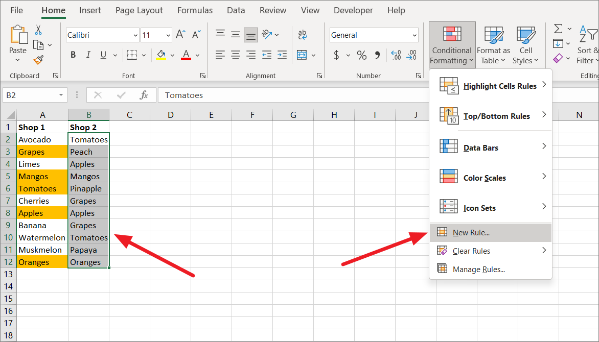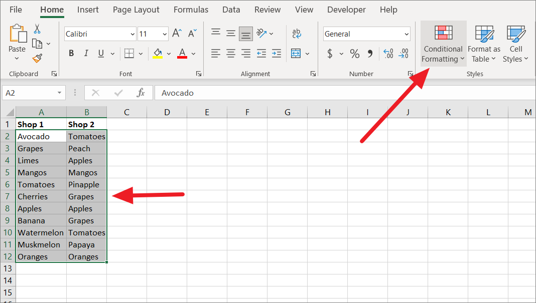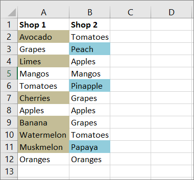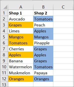For instance, we have two lists of fruits from different shops and we want to highlight the fruits that are available at both shops. Here’s how you can do that: