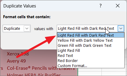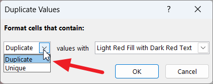 In the Duplicate Values dialog box, select ‘Duplicate’ from the left side drop-down.