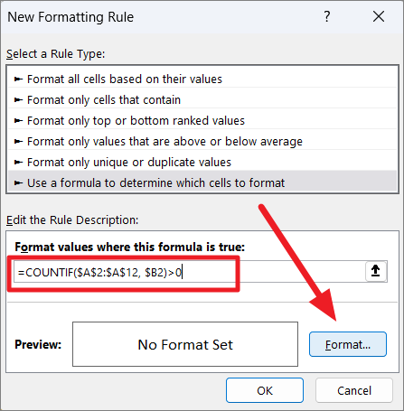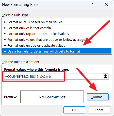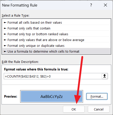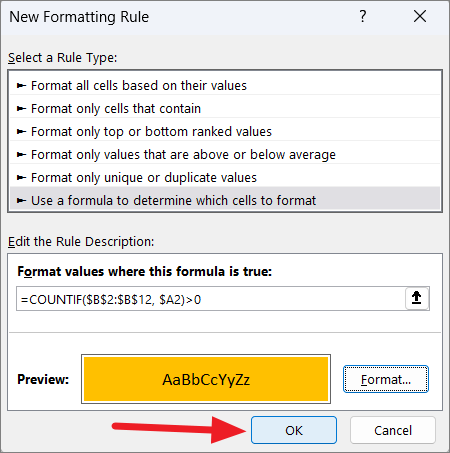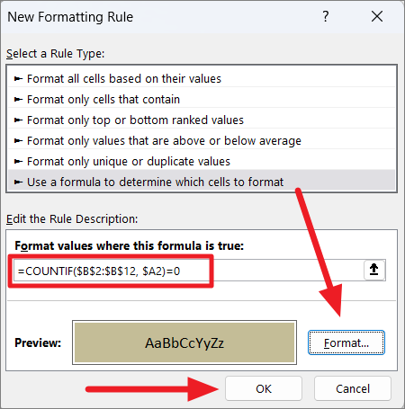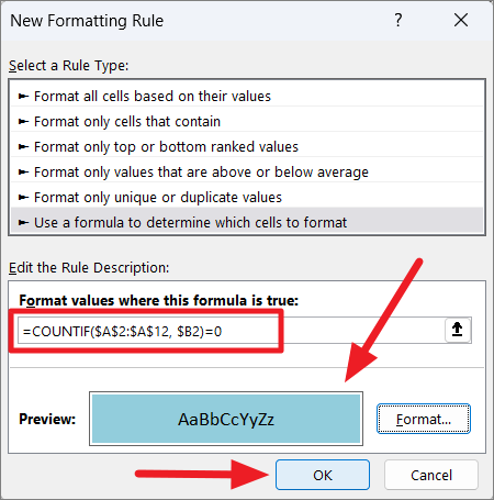 =COUNTIF($A$2:$A$12, $B2)=0After entering the formula, click the ‘Format’ button and specify the formatting for highlighting cells. Then, click ‘OK’ to apply it.