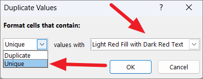 In the drop menu that says Duplicate, select ‘Unique’ and then choose predefined formatting for the mismatched data. Then, click ‘OK’.