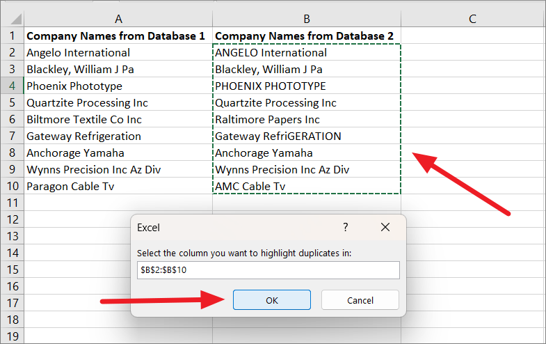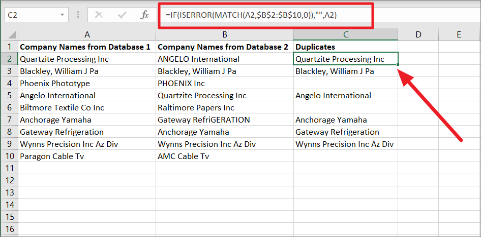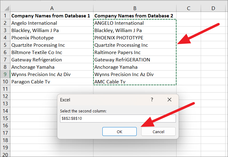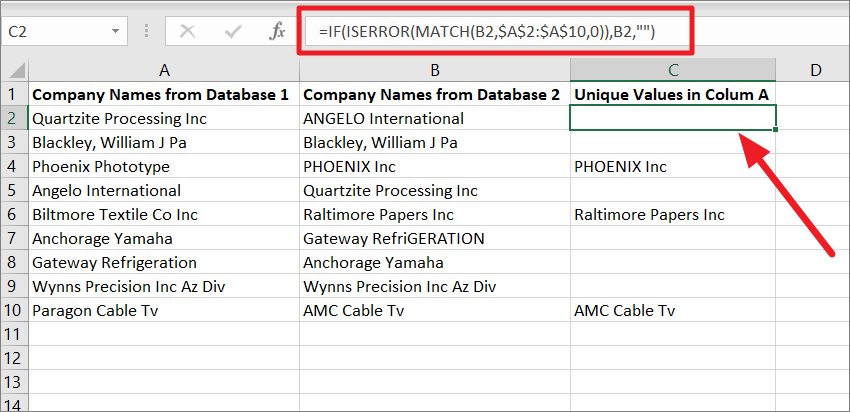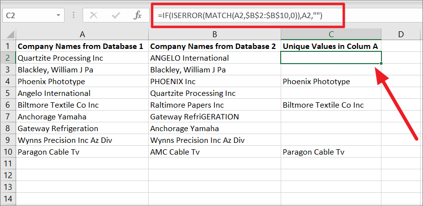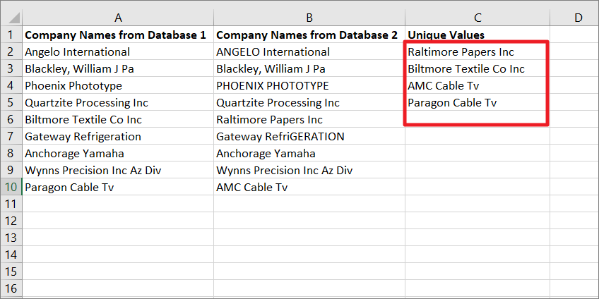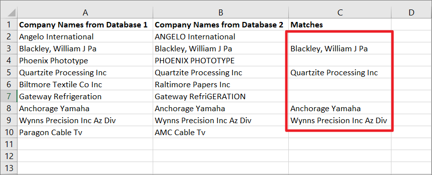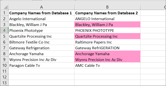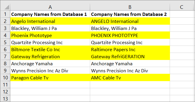 For example, let’s compare lists of company names from different databases and see if they are exact matches using the simple EXACT function: