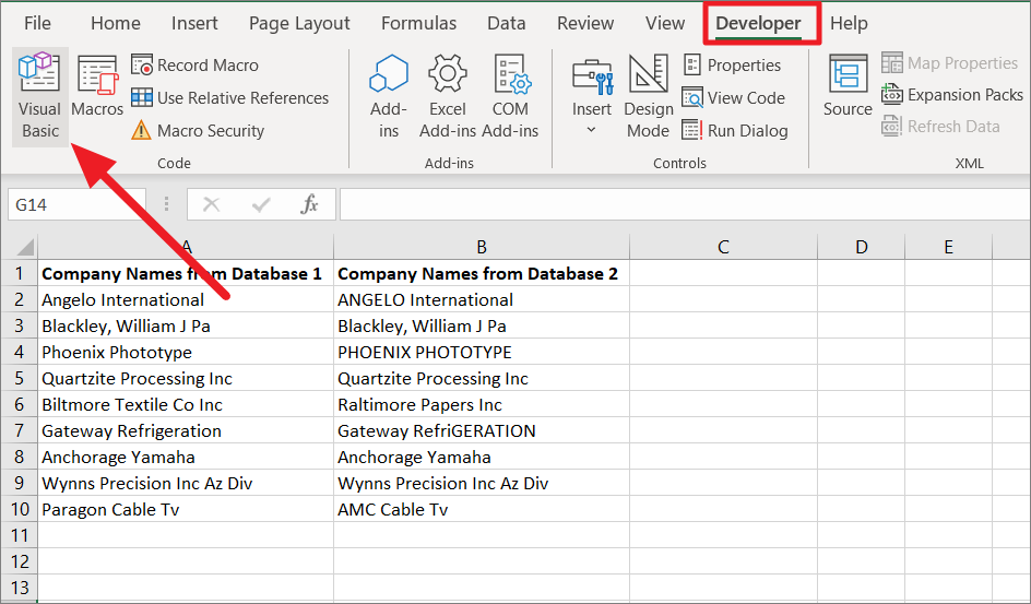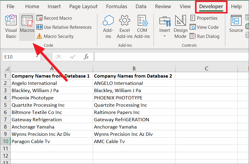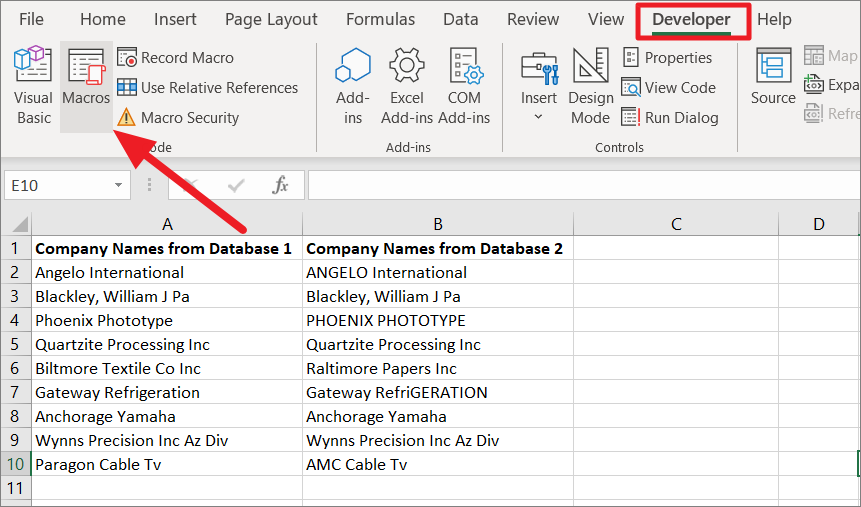 To run the VBA macro, switch to the ‘Developer’ tab and click ‘Macros’ from the Code group.
