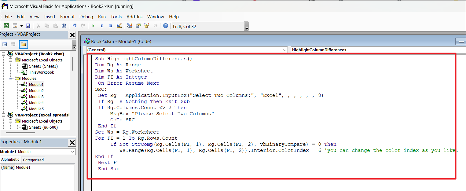 The above code allows you to compare two columns row by row and highlight the differences between them.
