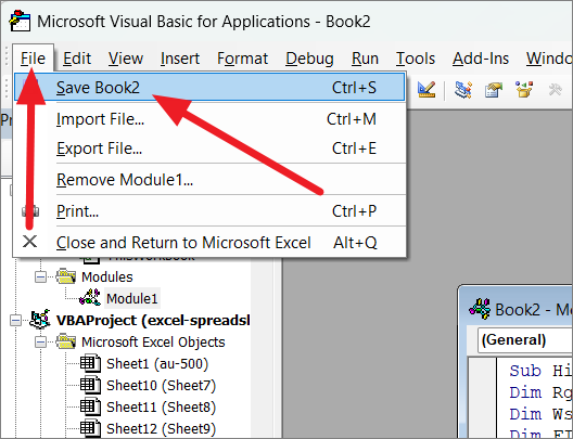 After pasting the script, click ‘File’ and select ‘Save XXXX (filename)’ to save this module as a macro.